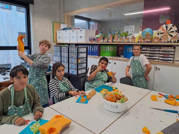 “Door zelf te koken, leren de kinderen andere groenten kennen dan ze gewoon zijn, of leren ze dat ook een kromme groente mee in de soep kan. We zien dit echt als een leerkans. Het is fantastisch om te zien dat de moeilijkste leerlingen soms de beste koks worden tijdens die kookmomenten. Ook ons schoolteam is helemaal mee in ons voedingsverhaal. Het thema leeft echt in onze school. Waar mogelijk komt het ook aan bod in de lessen.”
