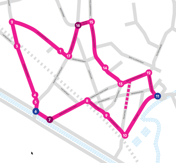 - Stoppen en afstappen aan het zebrapad. Oversteken en in de pastoor Bellonstraat opnieuw het zebrapad te voet oversteken. Rechts op de rijbaan fietsen.